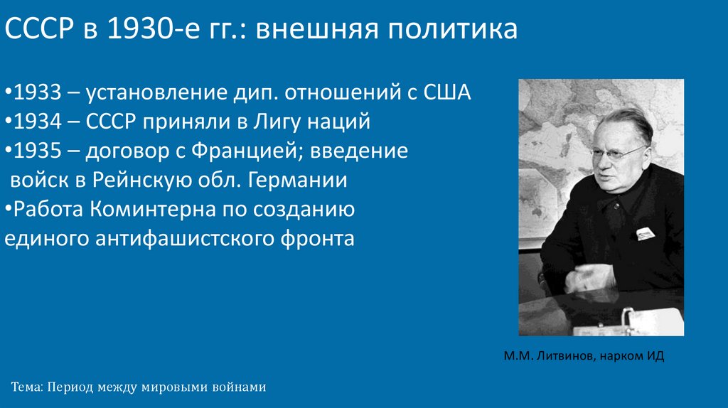 СССР в 1930-е гг.: внешняя политика•1933 – установление дип. отношений с США
