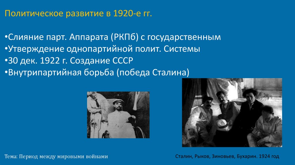 Политическое развитие в 1920-е гг.•Слияние парт. Аппарата (РКПб) с государственным