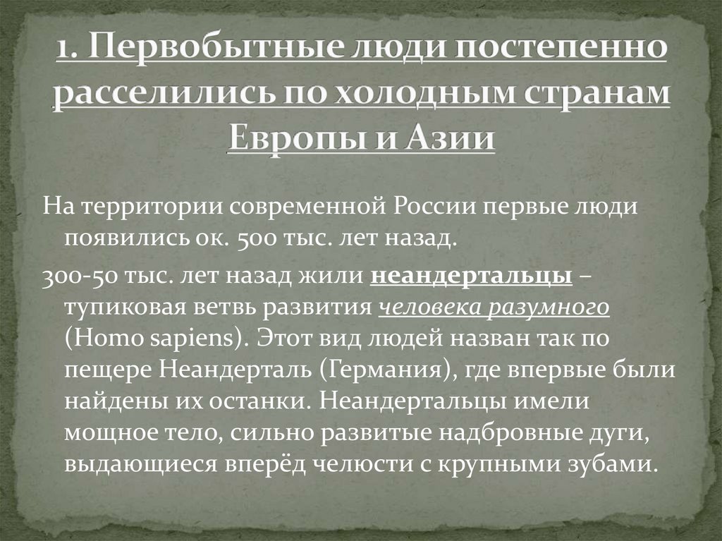 На территории современной России первые людипоявились ок. 500 тыс. лет назад.