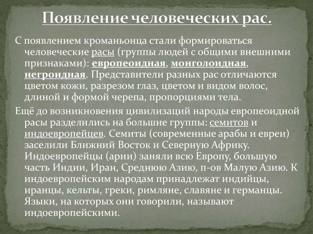 С появлением кроманьонца стали формироватьсячеловеческие расы (группы людей с общими внешними