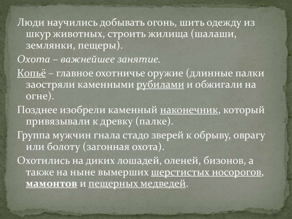 Люди научились добывать огонь, шить одежду изшкур животных, строить жилища (шалаши,
