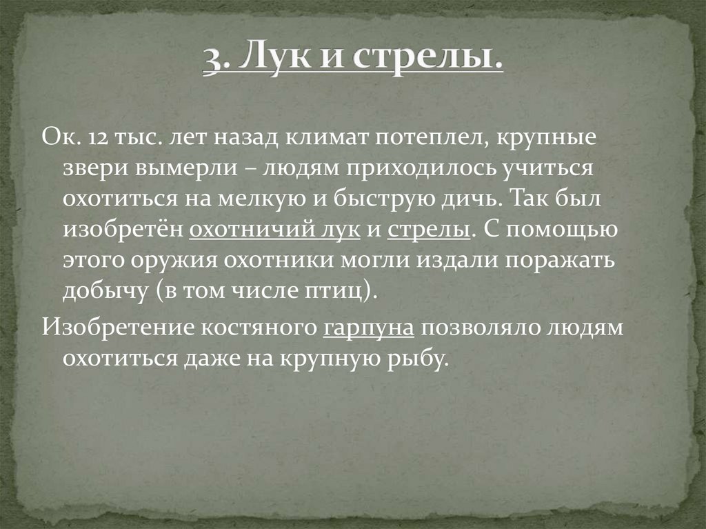 Ок. 12 тыс. лет назад климат потеплел, крупныезвери вымерли – людям приходилось учиться