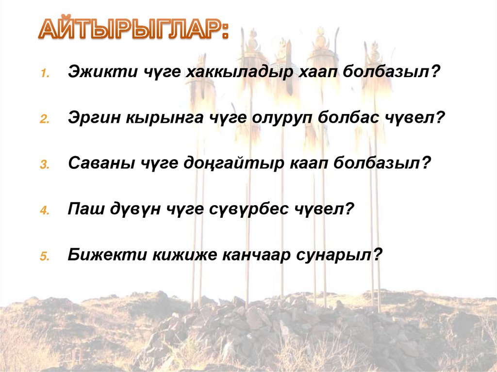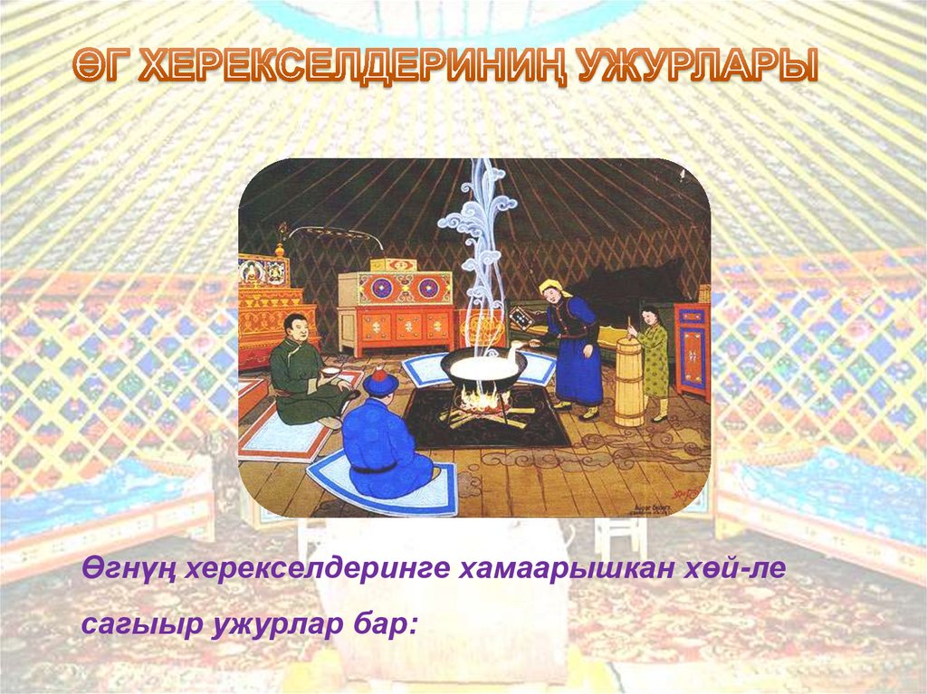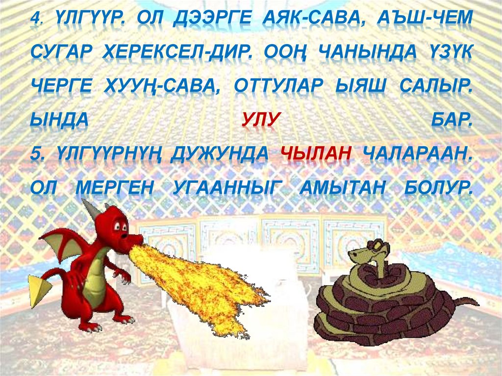 4. ҮЛГҮҮР. ОЛ ДЭЭРГЕ АЯК-САВА, АЪШ-ЧЕМСУГАР ХЕРЕКСЕЛ-ДИР. ООҢ ЧАНЫНДА ҮЗҮК