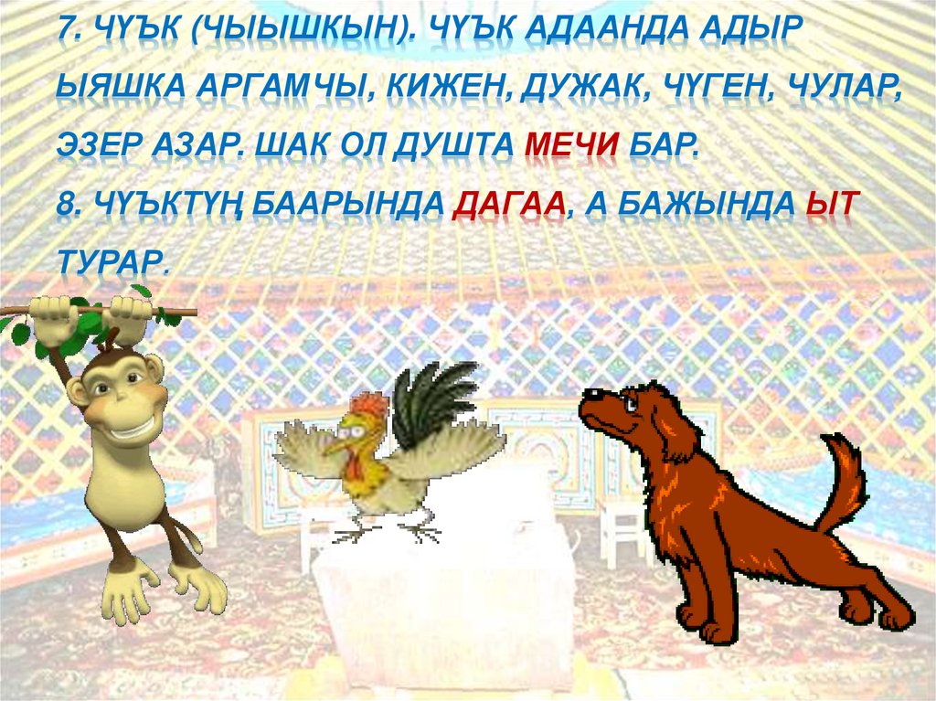 7. ЧҮЪК (ЧЫЫШКЫН). ЧҮЪК АДААНДА АДЫРЫЯШКА АРГАМЧЫ, КИЖЕН, ДУЖАК, ЧҮГЕН, ЧУЛАР,
