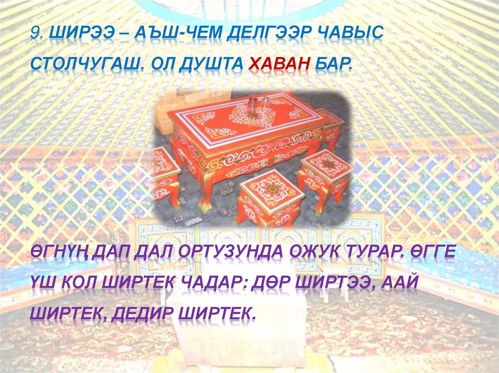 9. ШИРЭЭ – АЪШ-ЧЕМ ДЕЛГЭЭР ЧАВЫССТОЛЧУГАШ. ОЛ ДУШТА ХАВАН БАР.