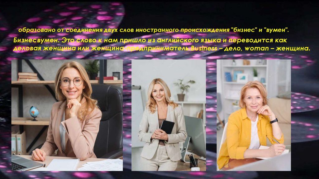 деловая женщина или женщина-предприниматель.Business – дело, woman – женщина.