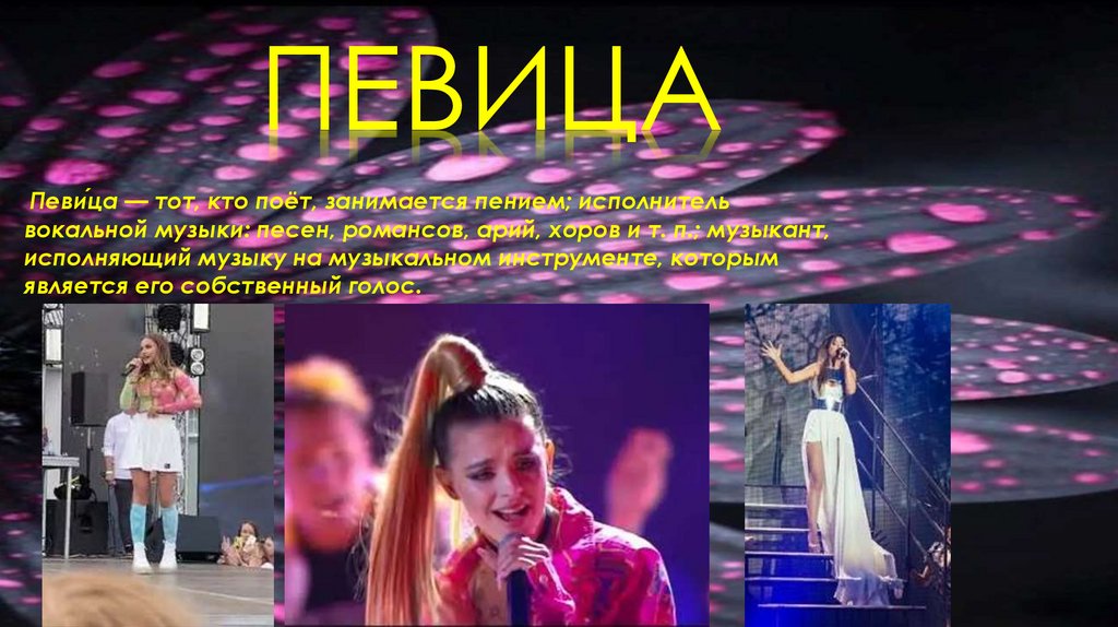 ПЕВИЦАПеви́ца — тот, кто поёт, занимается пением; исполнитель
