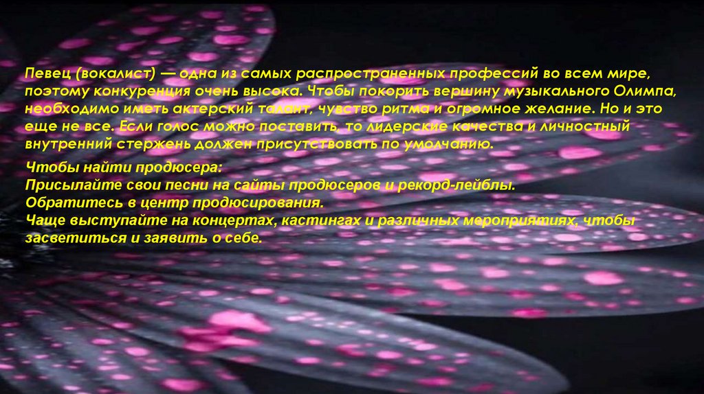 Певец (вокалист) — одна из самых распространенных профессий во всем мире,поэтому конкуренция очень высока. Чтобы покорить вершину музыкального Олимпа,
