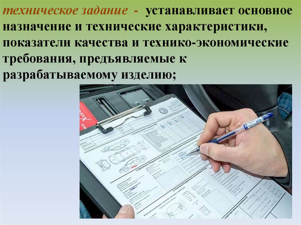 техническое задание - устанавливает основноеназначение и технические характеристики,