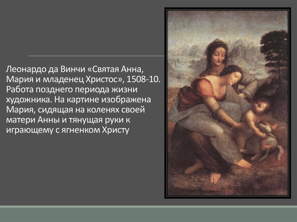 Леонардо да Винчи «Святая Анна,Мария и младенец Христос», 1508-10.