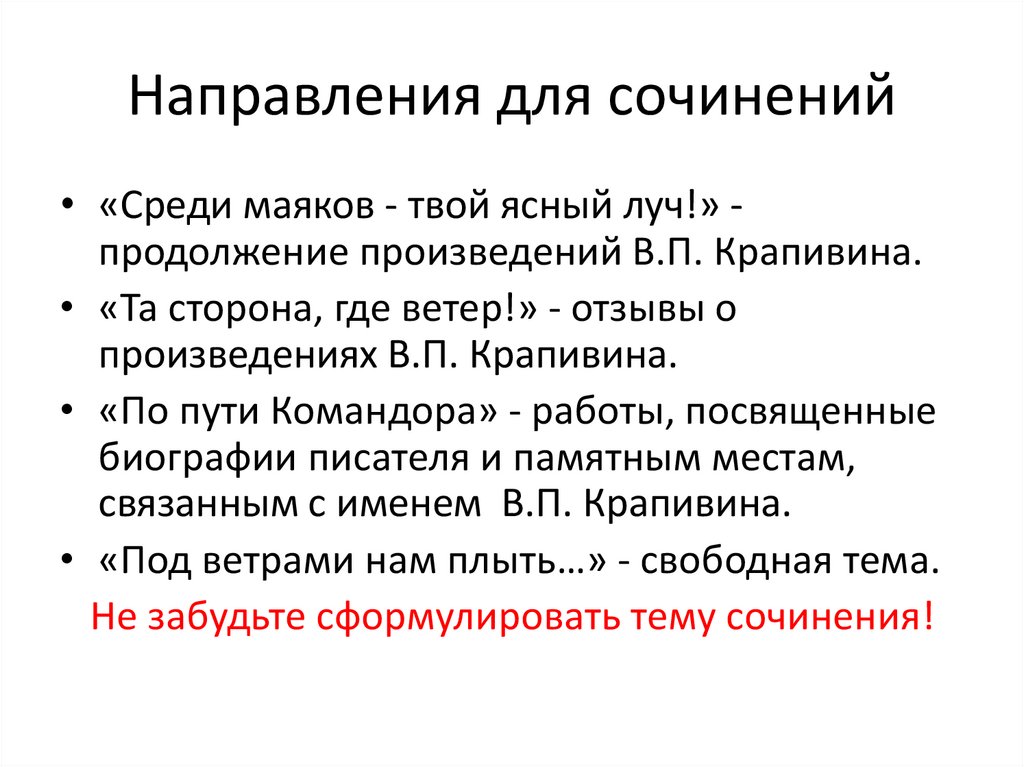 Направления для сочинений• «Среди маяков - твой ясный луч!» продолжение произведений В.П. Крапивина.