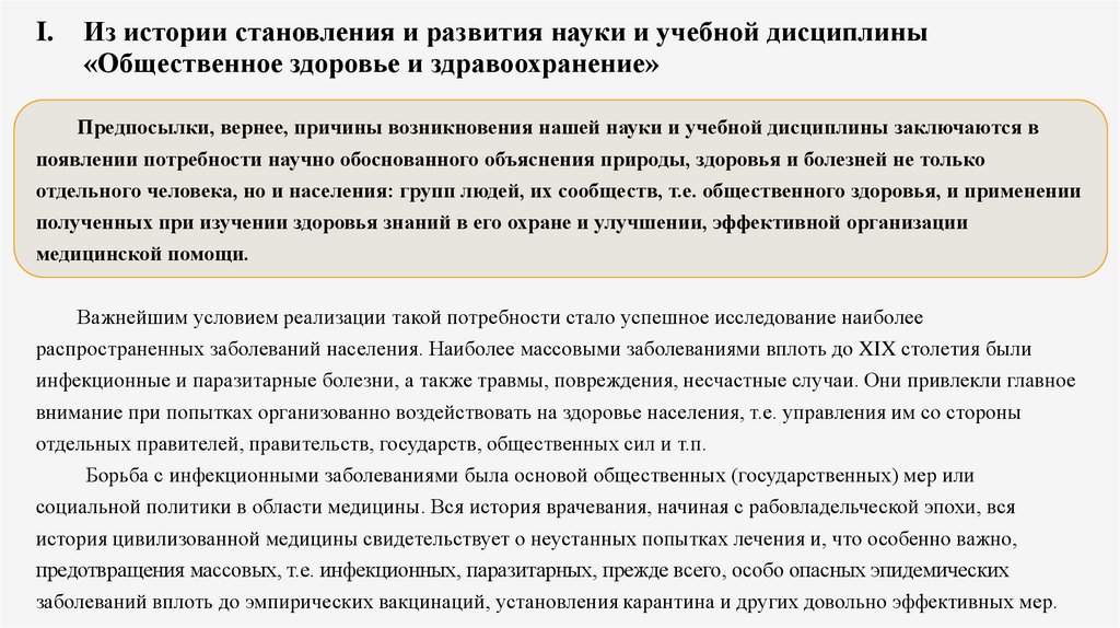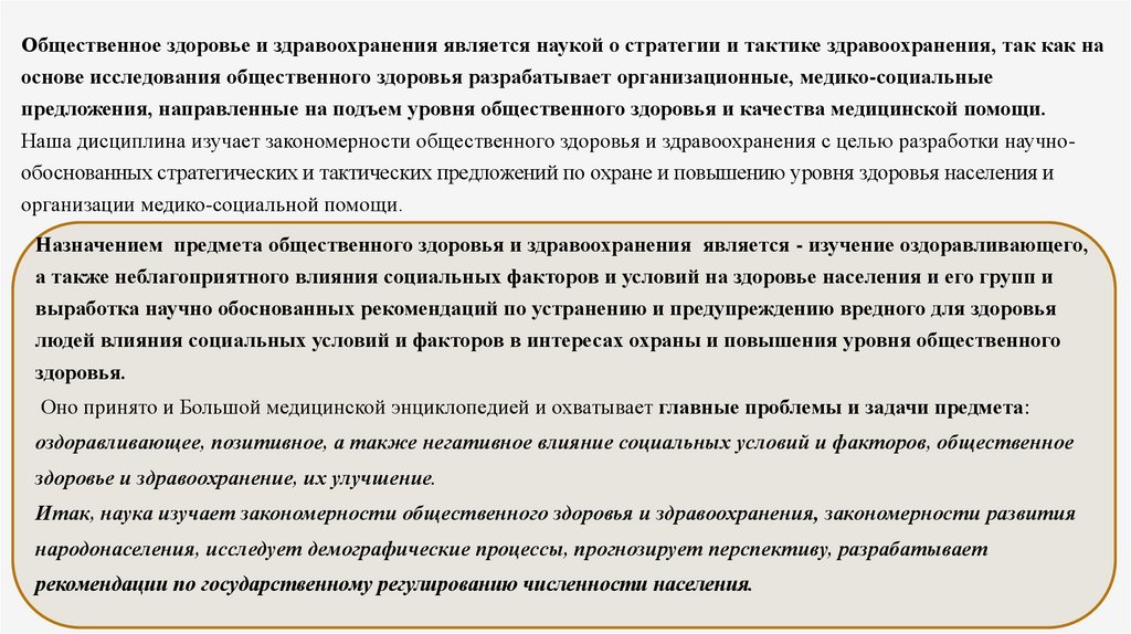 Наша дисциплина изучает закономерности общественного здоровья и здравоохранения с целью разработки научнообоснованных стратегических и тактических предложений по охране и повышению уровня здоровья населения и