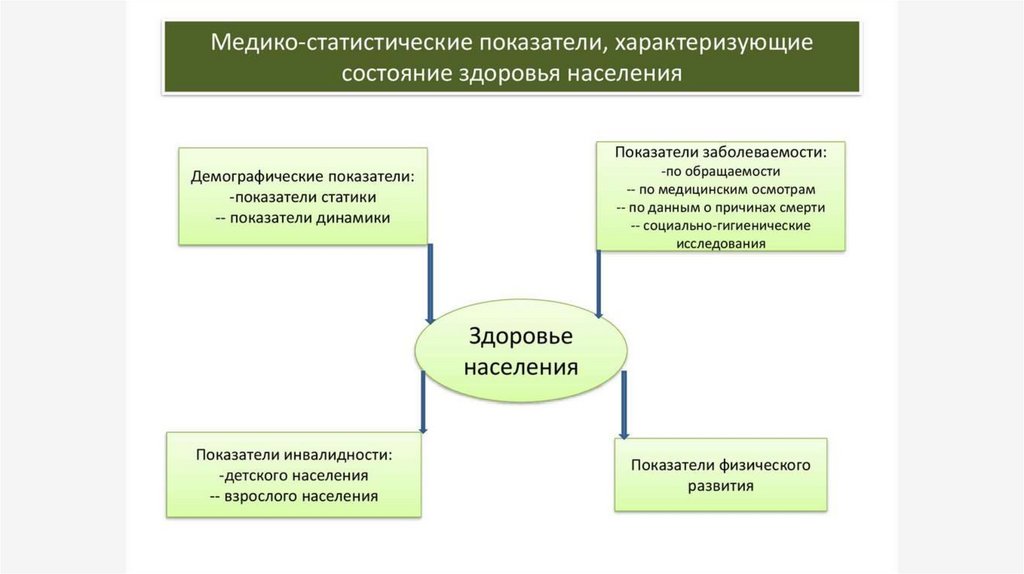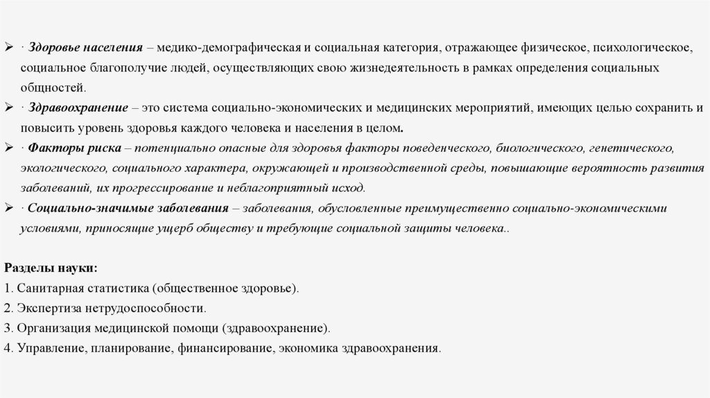 · Здоровье населения – медико-демографическая и социальная категория, отражающее физическое, психологическое,социальное благополучие людей, осуществляющих свою жизнедеятельность в рамках определения социальных