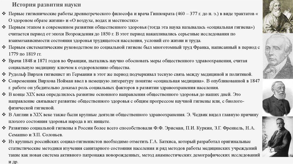 История развития наукиПервые гигиенические работы древнегреческого философа и врача Гиппократа (460 – 377 г. до н. э.) в виде трактатов «