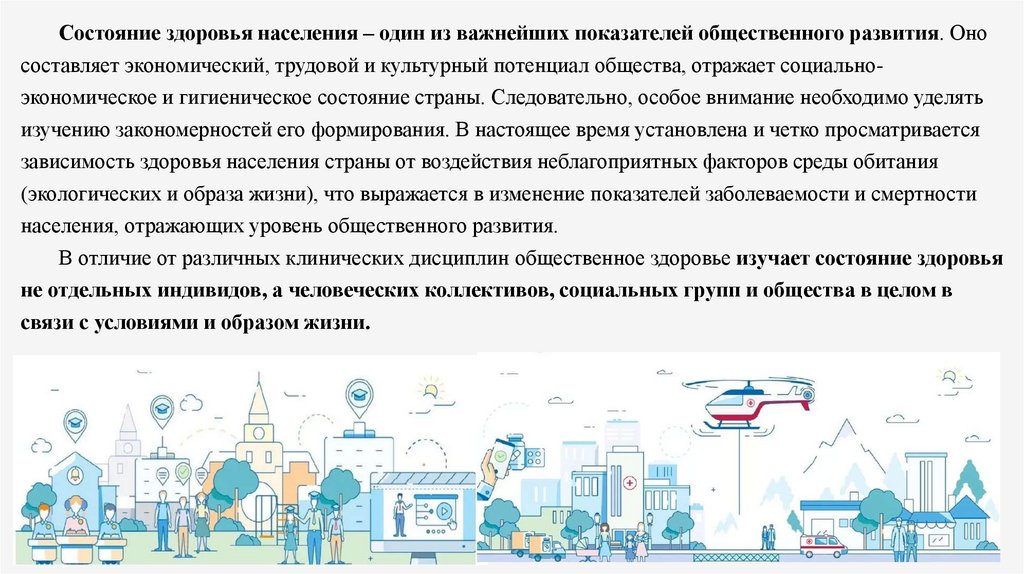 В отличие от различных клинических дисциплин общественное здоровье изучает состояние здоровья