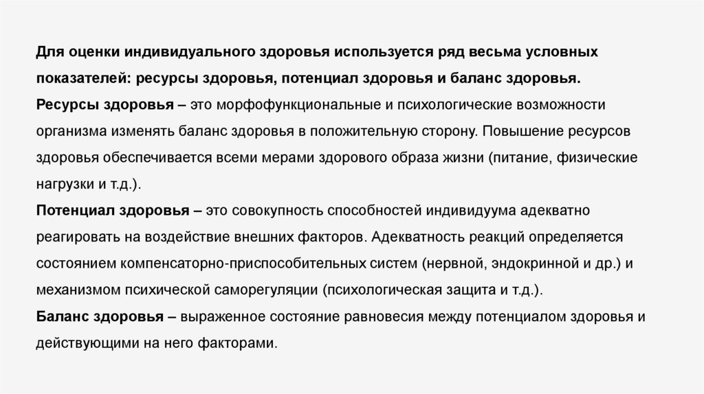 Для оценки индивидуального здоровья используется ряд весьма условныхпоказателей: ресурсы здоровья, потенциал здоровья и баланс здоровья.
