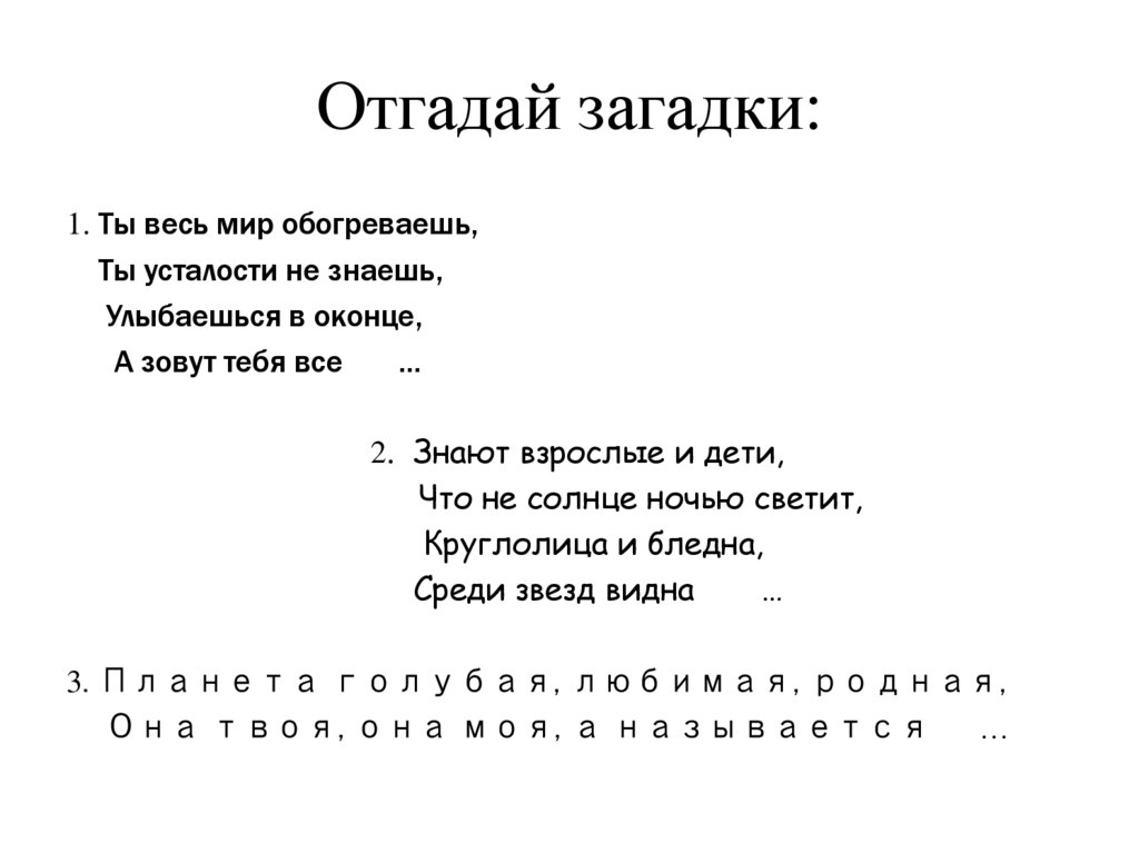 Отгадай загадки:1. Ты весь мир обогреваешь,