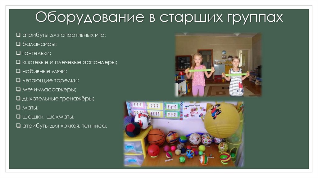 Оборудование в старших группахатрибуты для спортивных игр;