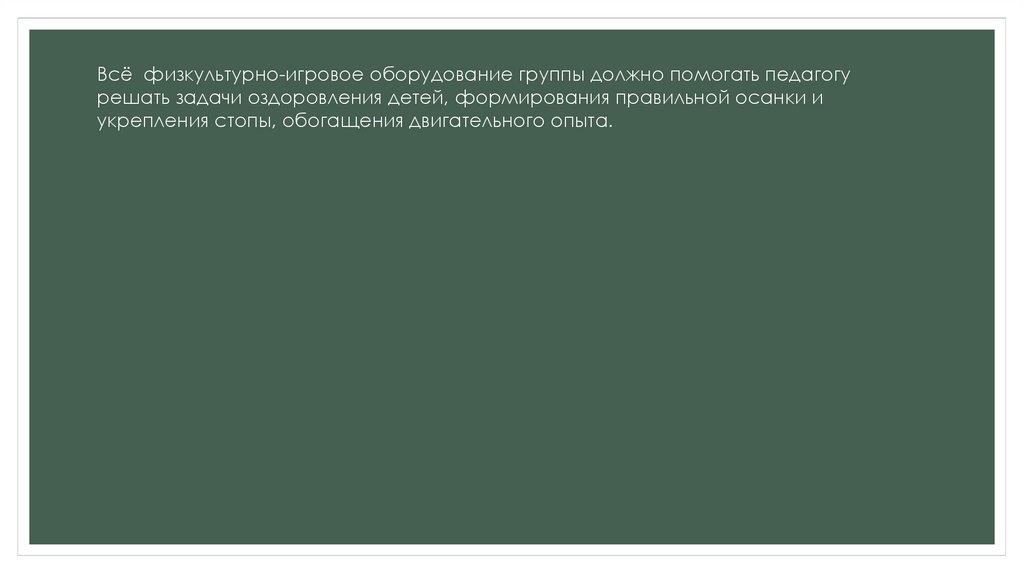 Всё физкультурно-игровое оборудование группы должно помогать педагогурешать задачи оздоровления детей, формирования правильной осанки и