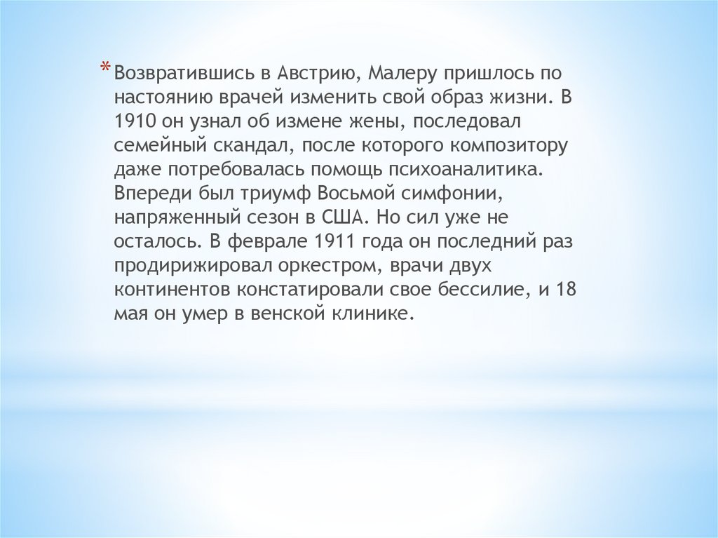 * Возвратившись в Австрию, Малеру пришлось понастоянию врачей изменить свой образ жизни. В
