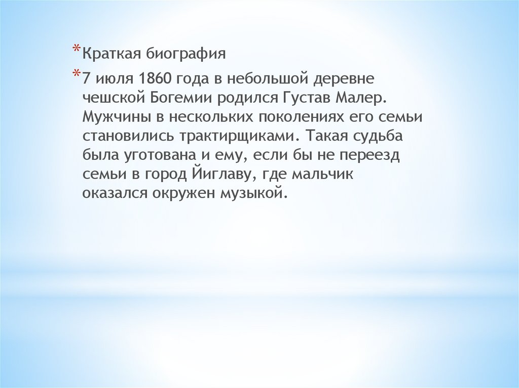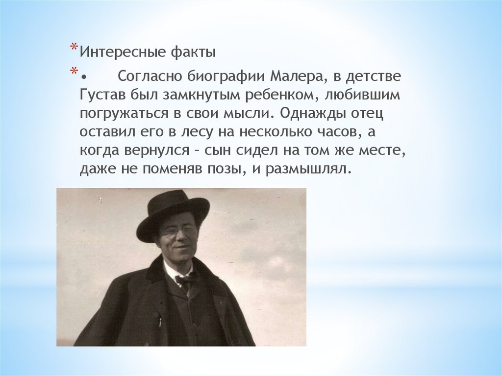 * Интересные факты* • Согласно биографии Малера, в детстве