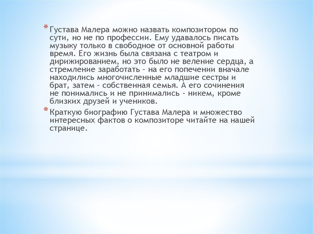* Густава Малера можно назвать композитором посути, но не по профессии. Ему удавалось писать
