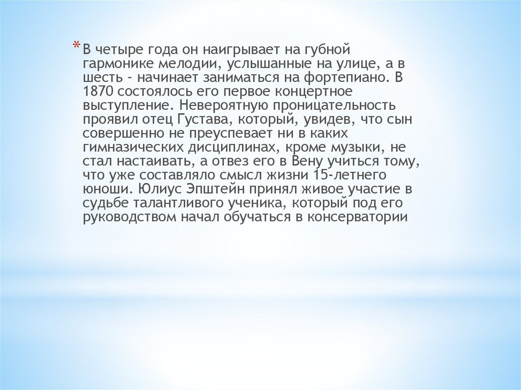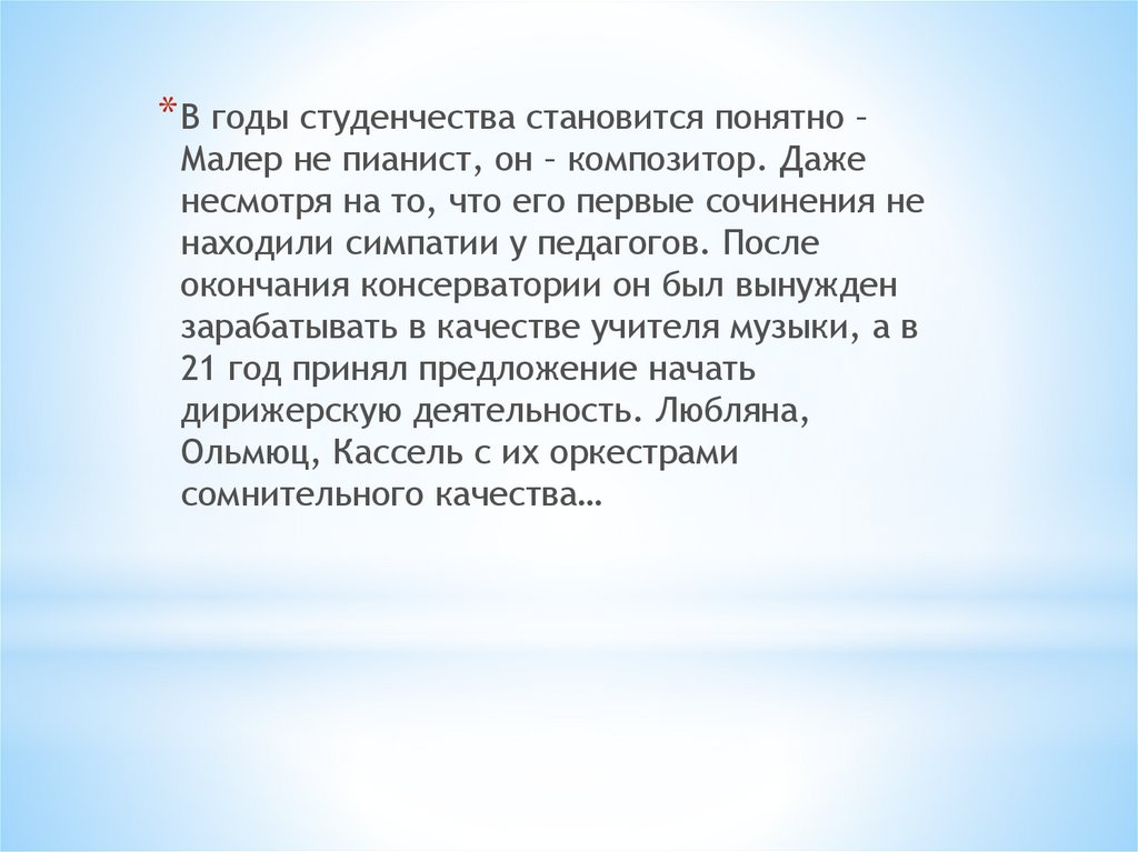 * В годы студенчества становится понятно –Малер не пианист, он – композитор. Даже
