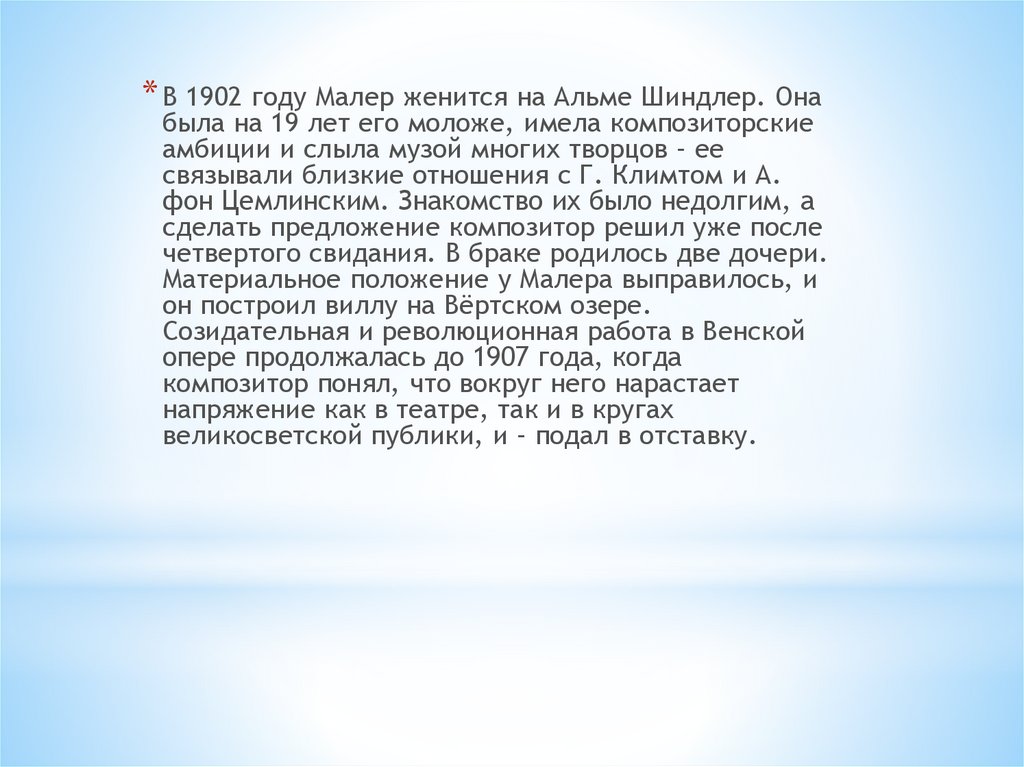 * В 1902 году Малер женится на Альме Шиндлер. Онабыла на 19 лет его моложе, имела композиторские
