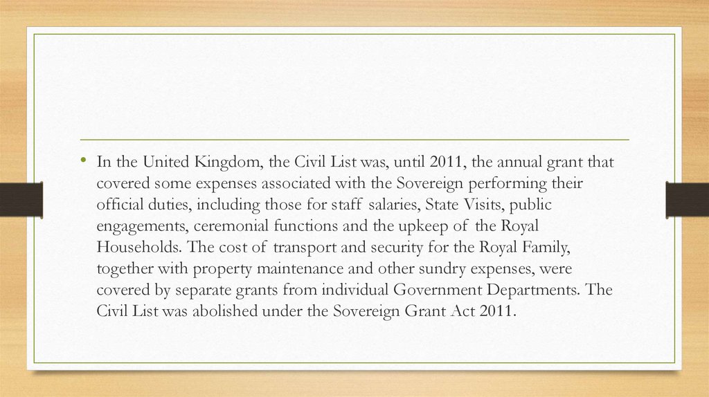 • In the United Kingdom, the Civil List was, until 2011, the annual grant thatcovered some expenses associated with the Sovereign performing their