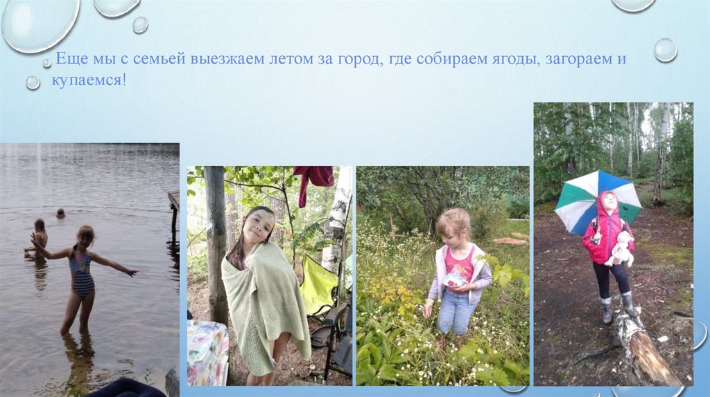 Еще мы с семьей выезжаем летом за город, где собираем ягоды, загораем икупаемся!