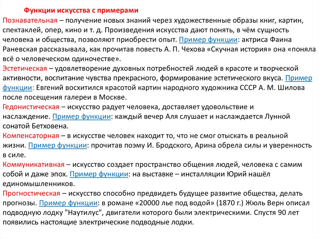 Функции искусства с примерамиПознавательная – получение новых знаний через художественные образы книг, картин,