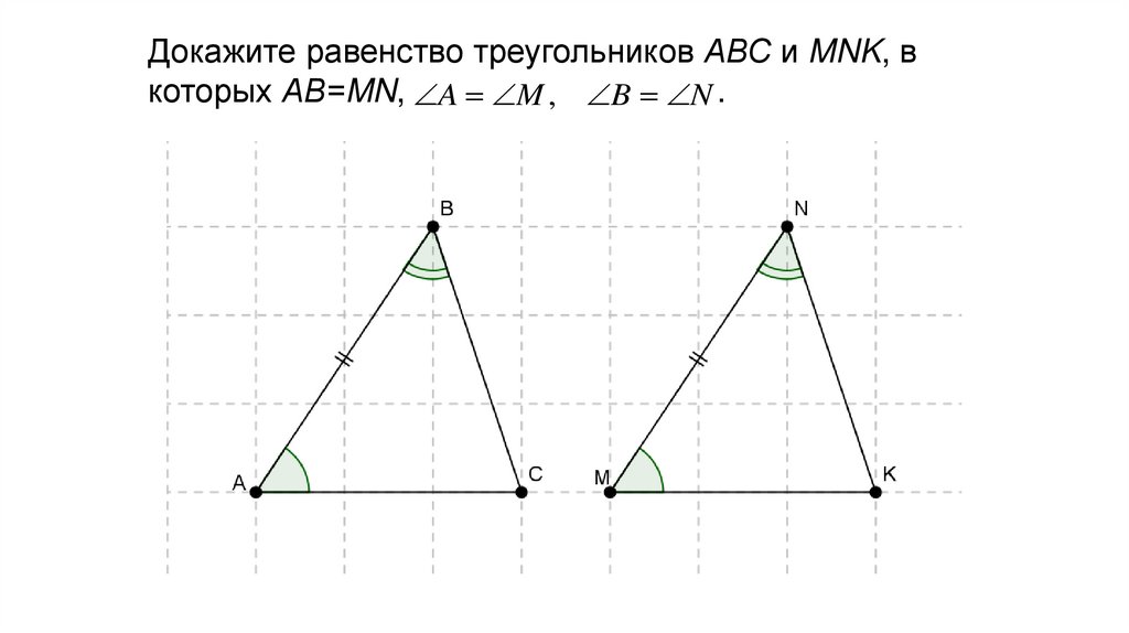 Докажите равенство треугольников АВС и MNK, вкоторых АВ=MN, A M , B N .