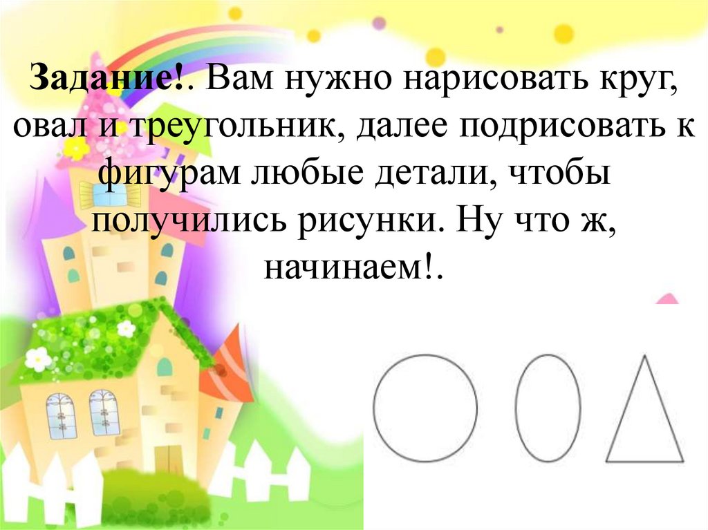 Задание!. Вам нужно нарисовать круг,овал и треугольник, далее подрисовать к