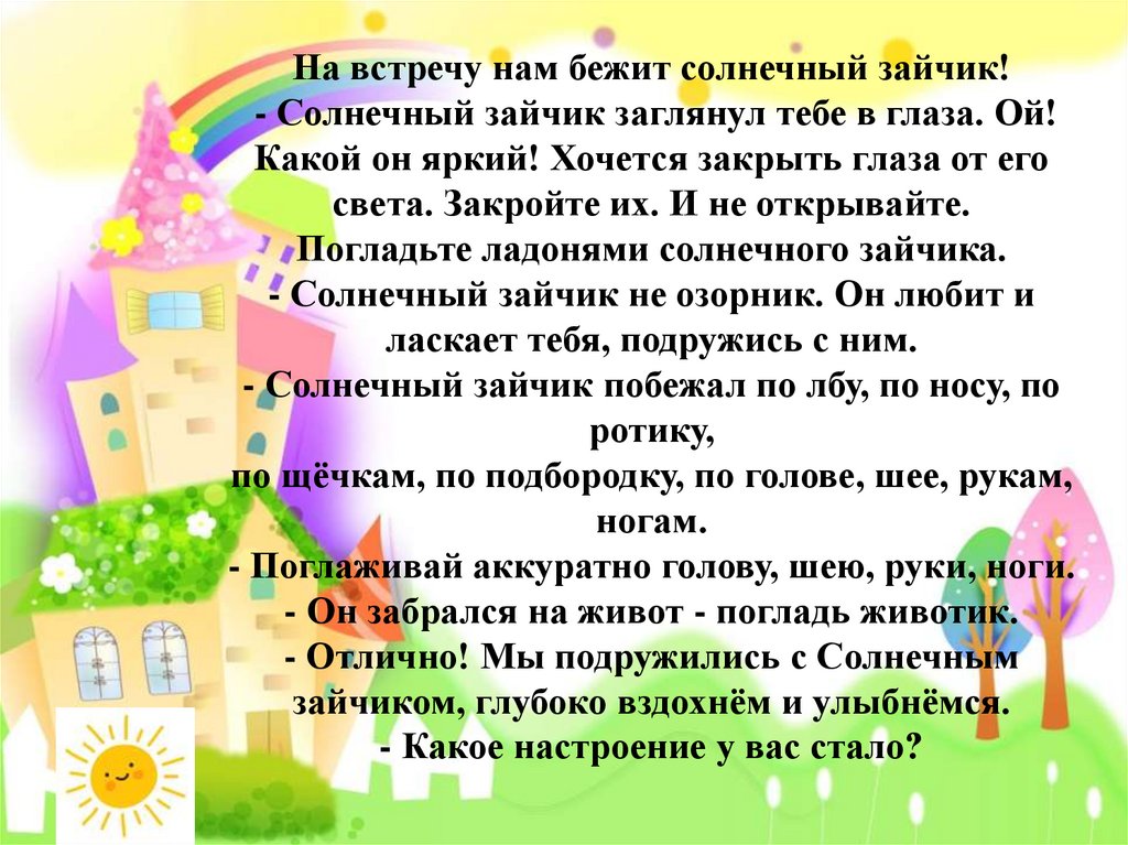 На встречу нам бежит солнечный зайчик!- Солнечный зайчик заглянул тебе в глаза. Ой!