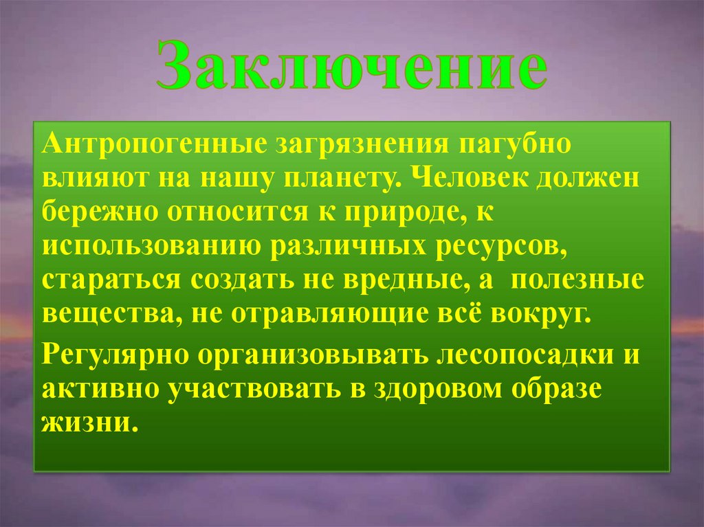 Антропогенные загрязнения пагубновлияют на нашу планету. Человек должен
