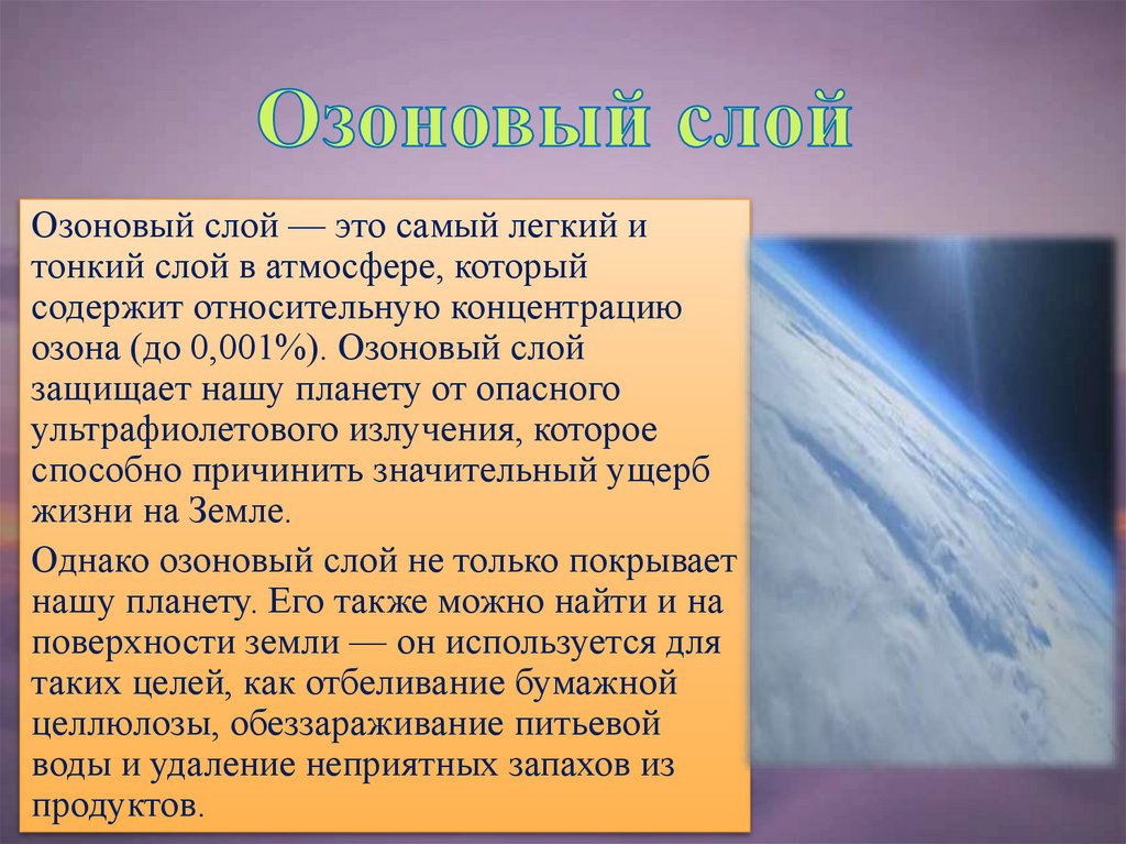 Озоновый слой — это самый легкий итонкий слой в атмосфере, который