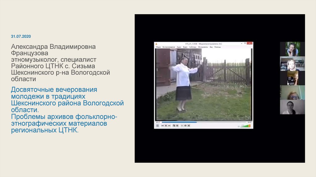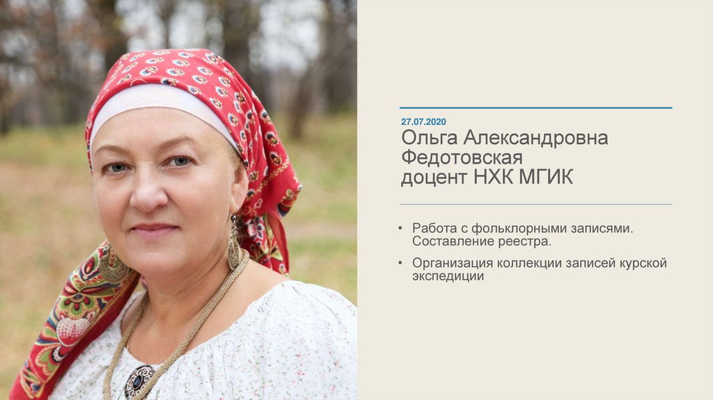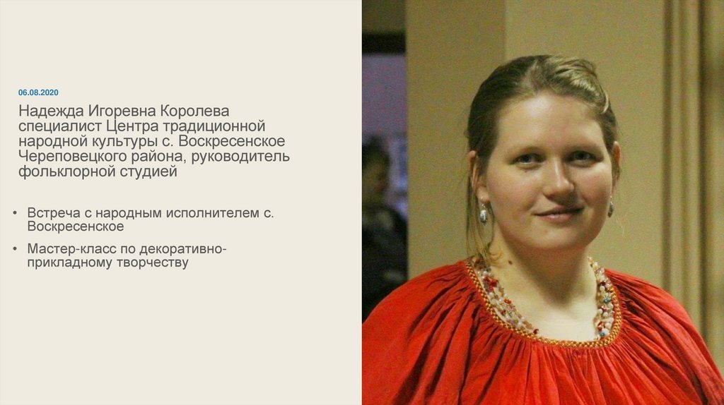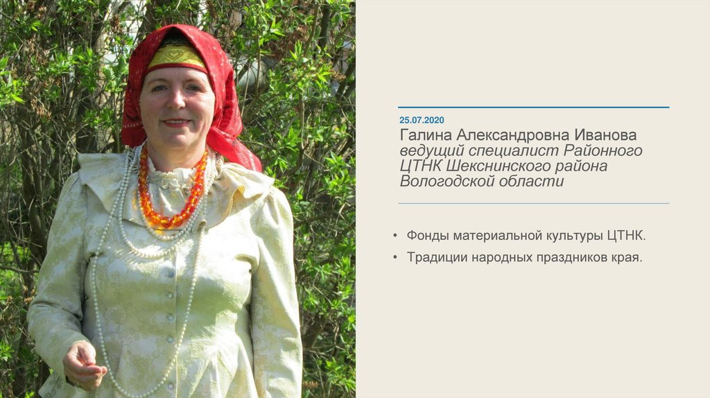 ВОЛОГОДСКОЙ ОБЛАСТИ, РУКОВОДИТЕЛЬ ФОЛЬКЛОРНОЭТНОГРАФИЧЕСКОЙ СТУДИИ «НАСЛЕДИЕ»