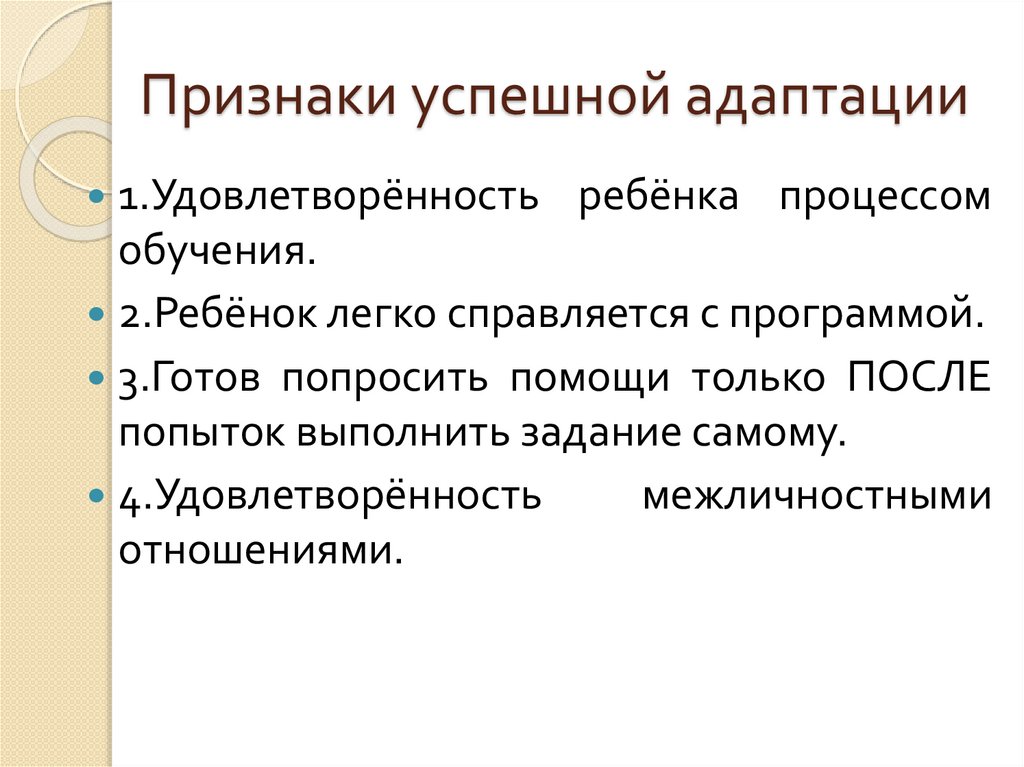 Признаки успешной адаптации1.Удовлетворённость ребёнка процессом