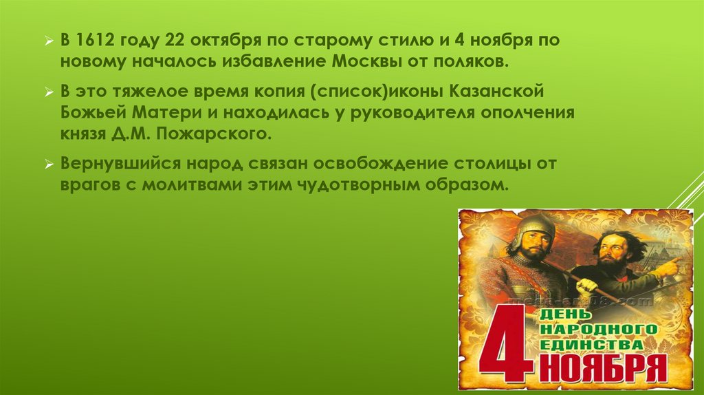 В 1612 году 22 октября по старому стилю и 4 ноября поновому началось избавление Москвы от поляков.