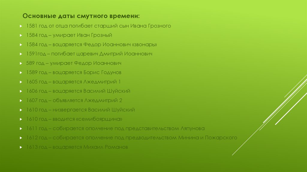 Основные даты смутного времени:1581 год от отца погибает старший сын Ивана Грозного