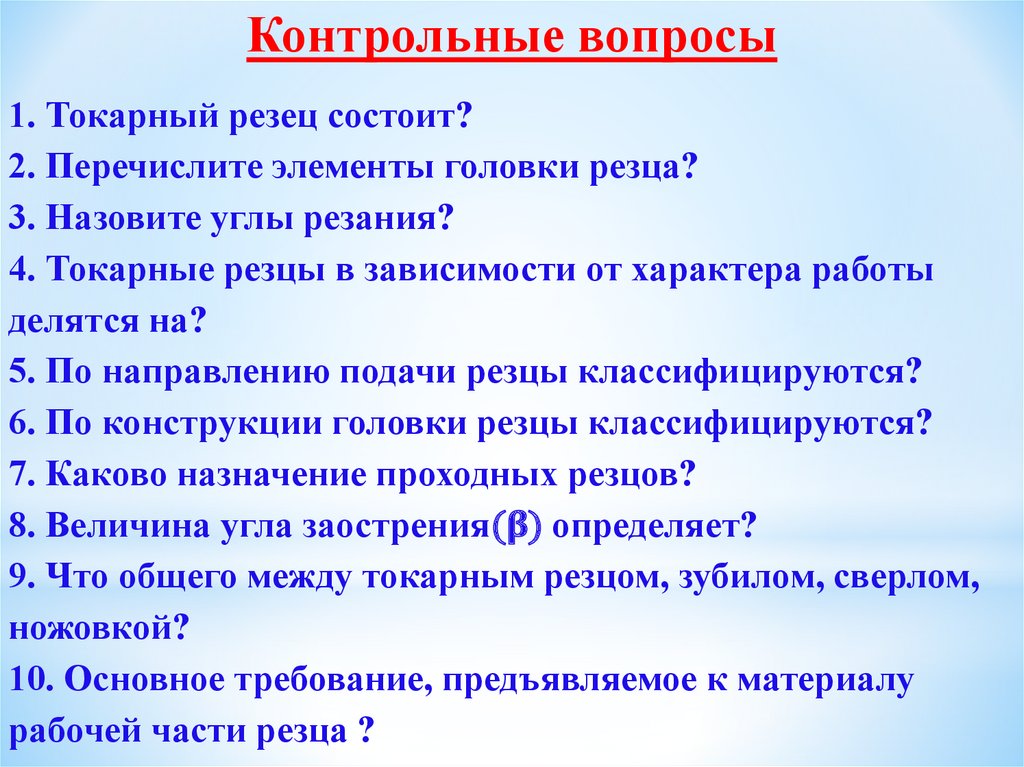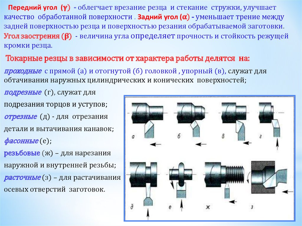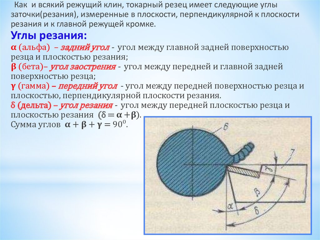 Как и всякий режущий клин, токарный резец имеет следующие углызаточки(резания), измеренные в плоскости, перпендикулярной к плоскости