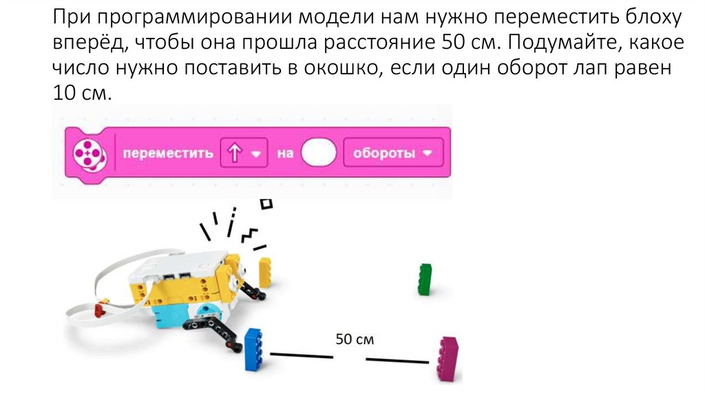 При программировании модели нам нужно переместить блохувперёд, чтобы она прошла расстояние 50 см. Подумайте, какое