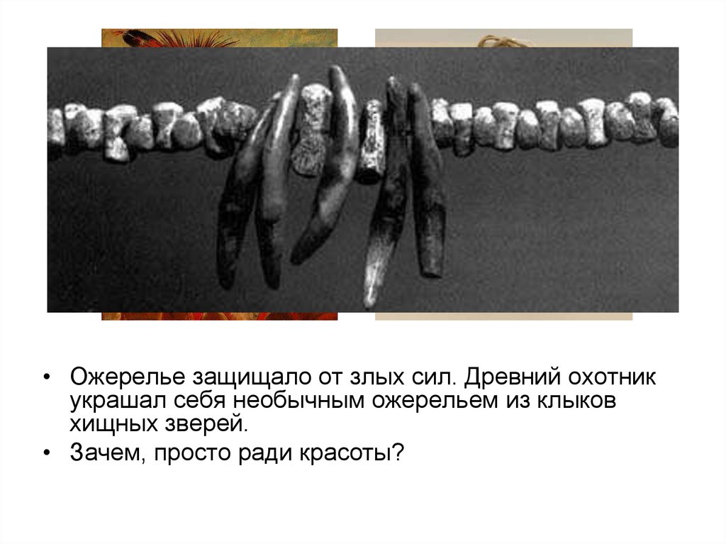 • Ожерелье защищало от злых сил. Древний охотникукрашал себя необычным ожерельем из клыков