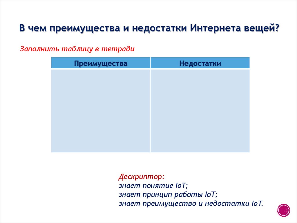 В чем преимущества и недостатки Интернета вещей?Заполнить таблицу в тетради