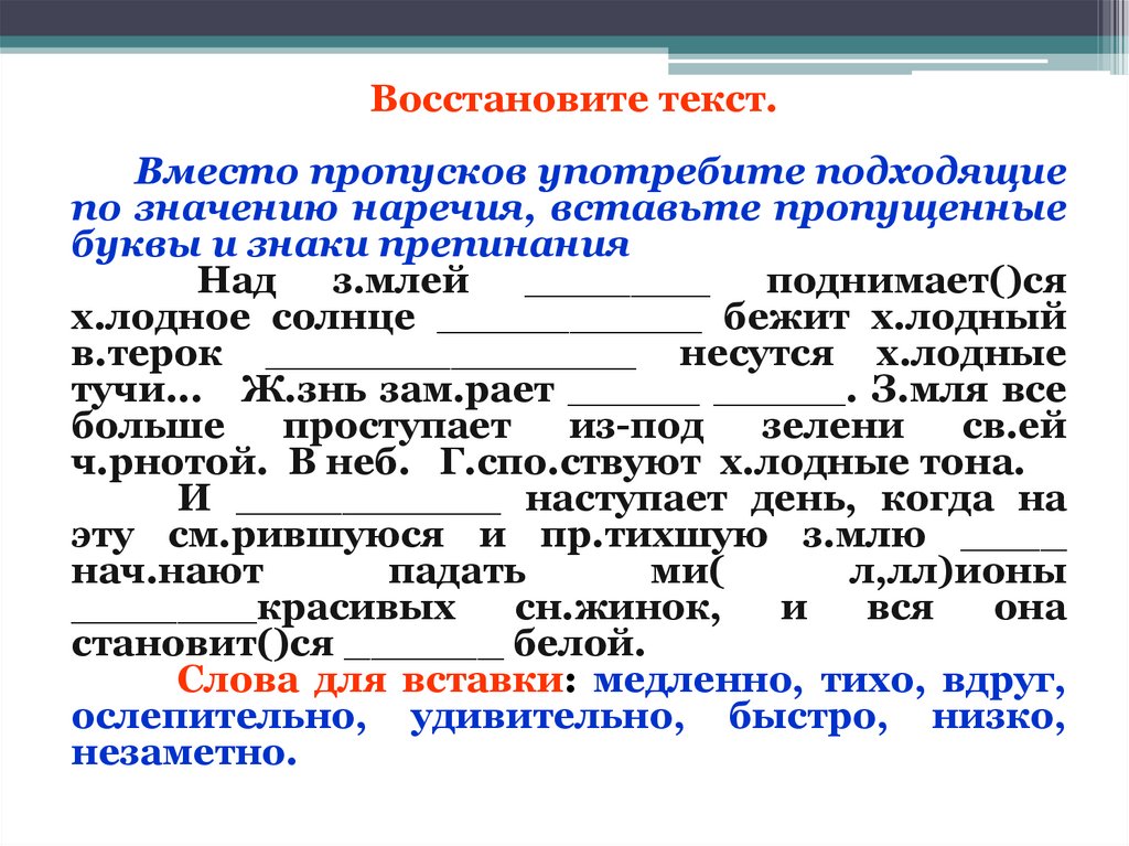 Слова для вставки: медленно, тихо, вдруг,