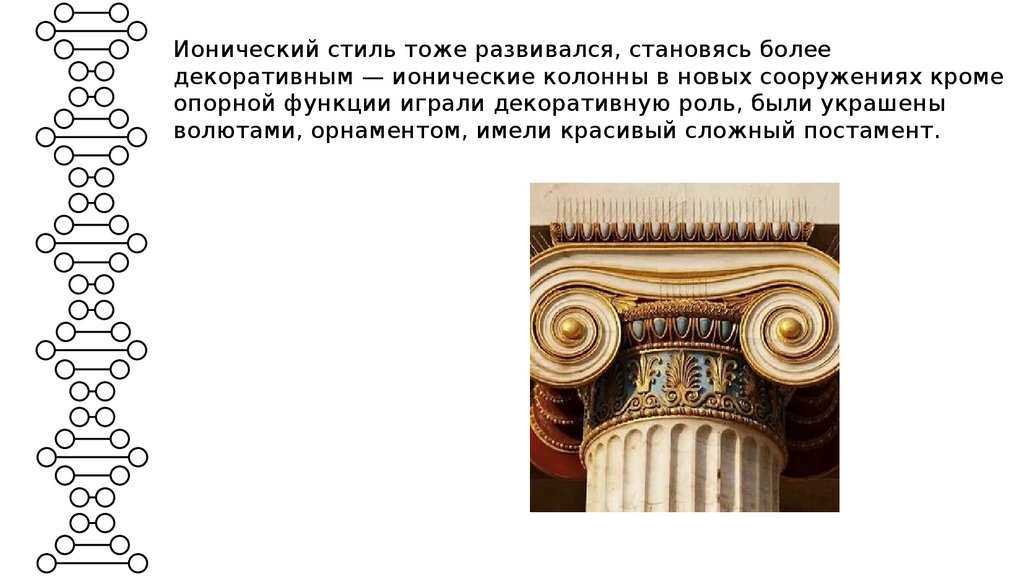 Ионический стиль тоже развивался, становясь болеедекоративным — ионические колонны в новых сооружениях кроме
