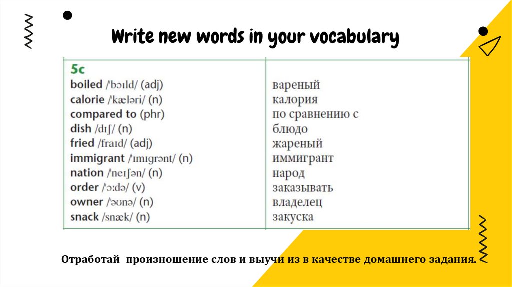 Write new words in your vocabularyОтработай произношение слов и выучи из в качестве домашнего задания.
