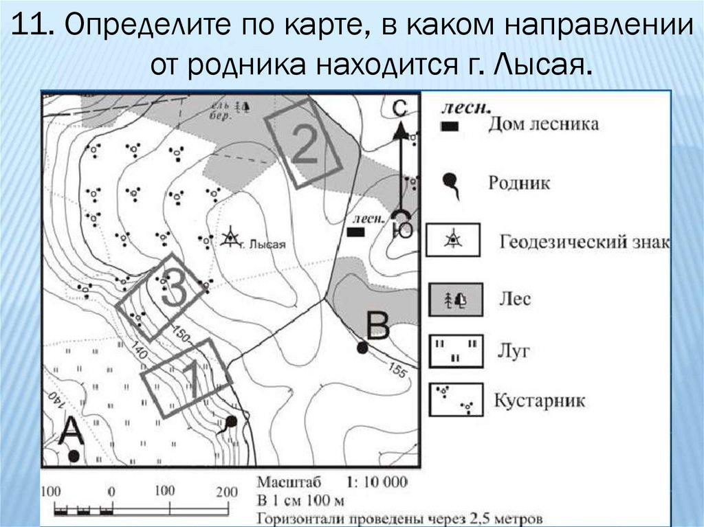 11. Определите по карте, в каком направленииот родника находится г. Лысая.