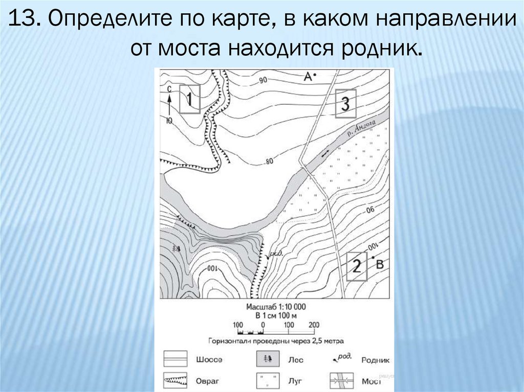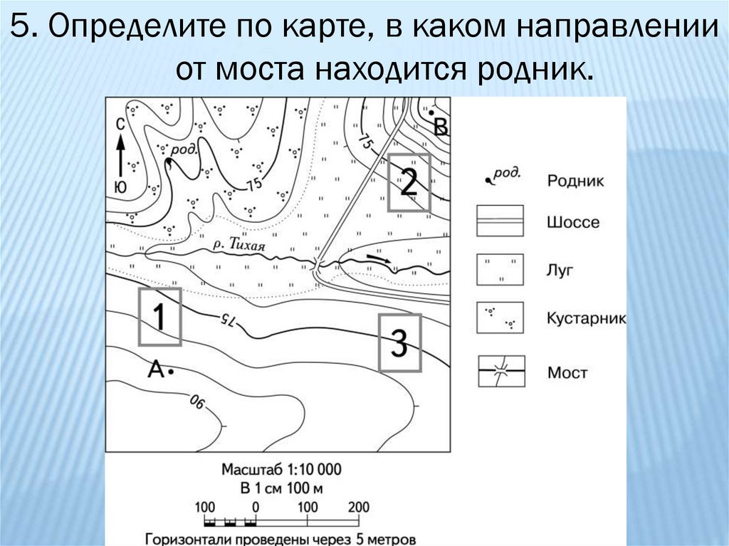 2. Определите по карте, в какомнаправлении от родника находится овраг.