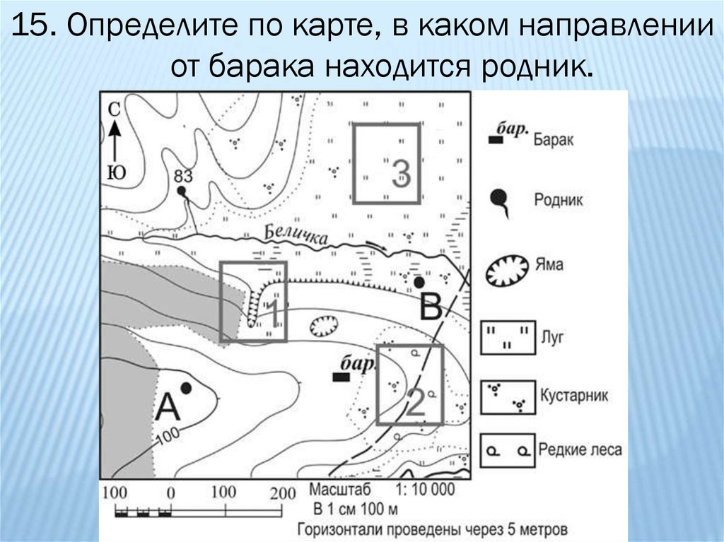 16. Определите по карте, в каком направленииот церкви находится родник.